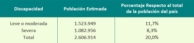 Se estima que unas 2.606.914 personas en el país presentan algún grado de discapacidad. De ellas, 1.523.949 tienen una discapacidad leve o moderada, mientras que 1.082.965 personas tienen una discapacidad severa.